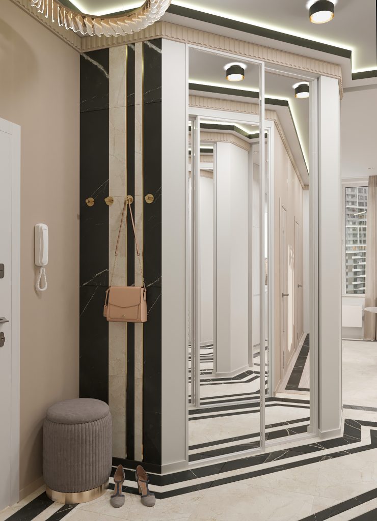 Также мы учли эргономику пространства, позаботившись, чтобы оригинальная геометрия не стала дискомфортом. Так, у входа разместилась консоль с выдвижными ящиками. Здесь же, неподалеку — мягкий пуф и крючки для одежды. И обязательная часть: система хранения в виде шкафа-купе с зеркальными фасадами и длинного гардероба с распашными дверцами.