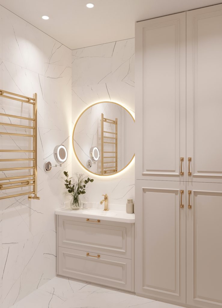 Тем не менее, отличие не только в цветовой гамме. Так, для девушек мы предусмотрели более обширную систему хранения: большую тумбу под раковиной (к слову, и габариты самой раковины больше, чем в мужской части), шкаф до потолка, а также полки с подсветкой в душевой.