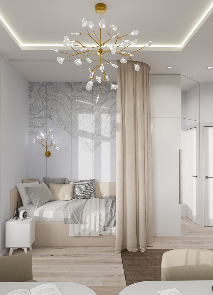 Но добавили детали, делающие пространство более интересным, игривым, соответствующим нраву юных жильцов. Так, появились акцентные элементы освещения – люстры и бра с плафонами-«лепестками». Также мы сделали принт на стенах за кроватями — имитацию волны.