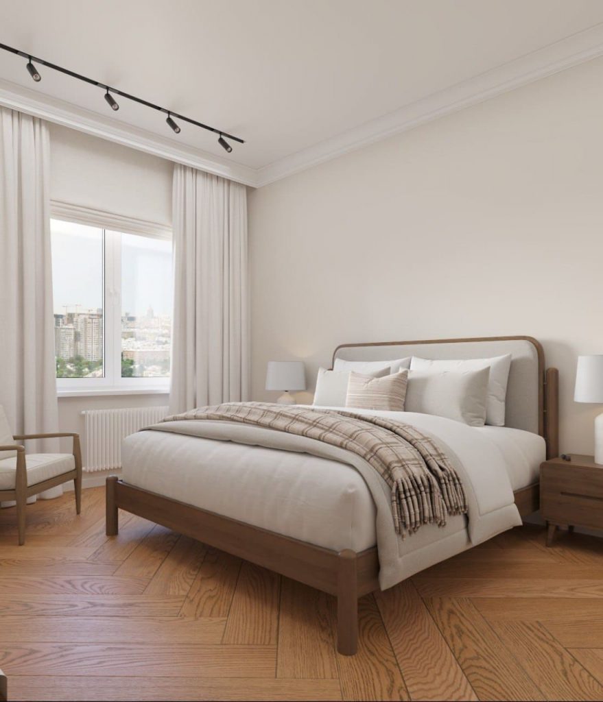 Кровать с деревянным каркасом и мягким изголовьем сразу притягивает взгляд — она словно создана для того, чтобы укутаться пледом и никуда не спешить. Боковые тумбы в том же тоне поддерживают композицию и добавляют уюта. Мы специально отказались от визуального шума — вместо декора на стенах сделали ставку на текстуры и мягкие сочетания.