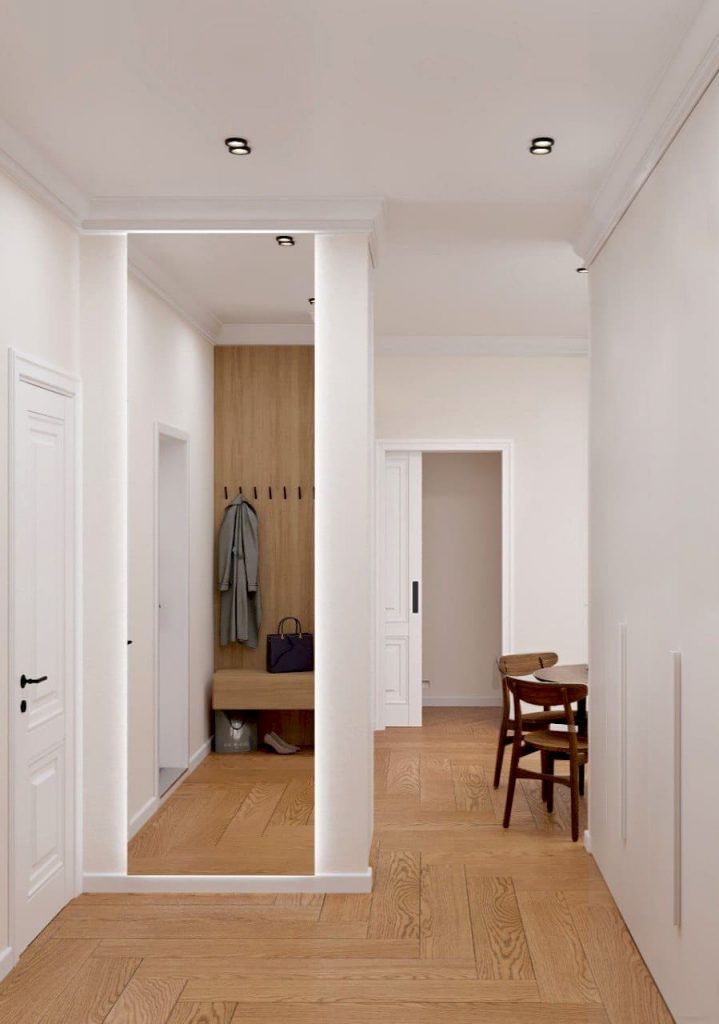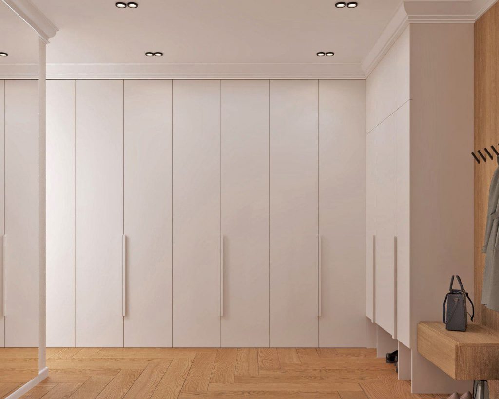 По просьбе хозяйки добавили зеркало в рост — оно не только функционально, но и визуально расширяет пространство у шкафа. Гладкие фасады шкафа полностью интегрированы в интерьер и «растворяются» на фоне стены — при этом за ними скрывается полноценная система хранения.