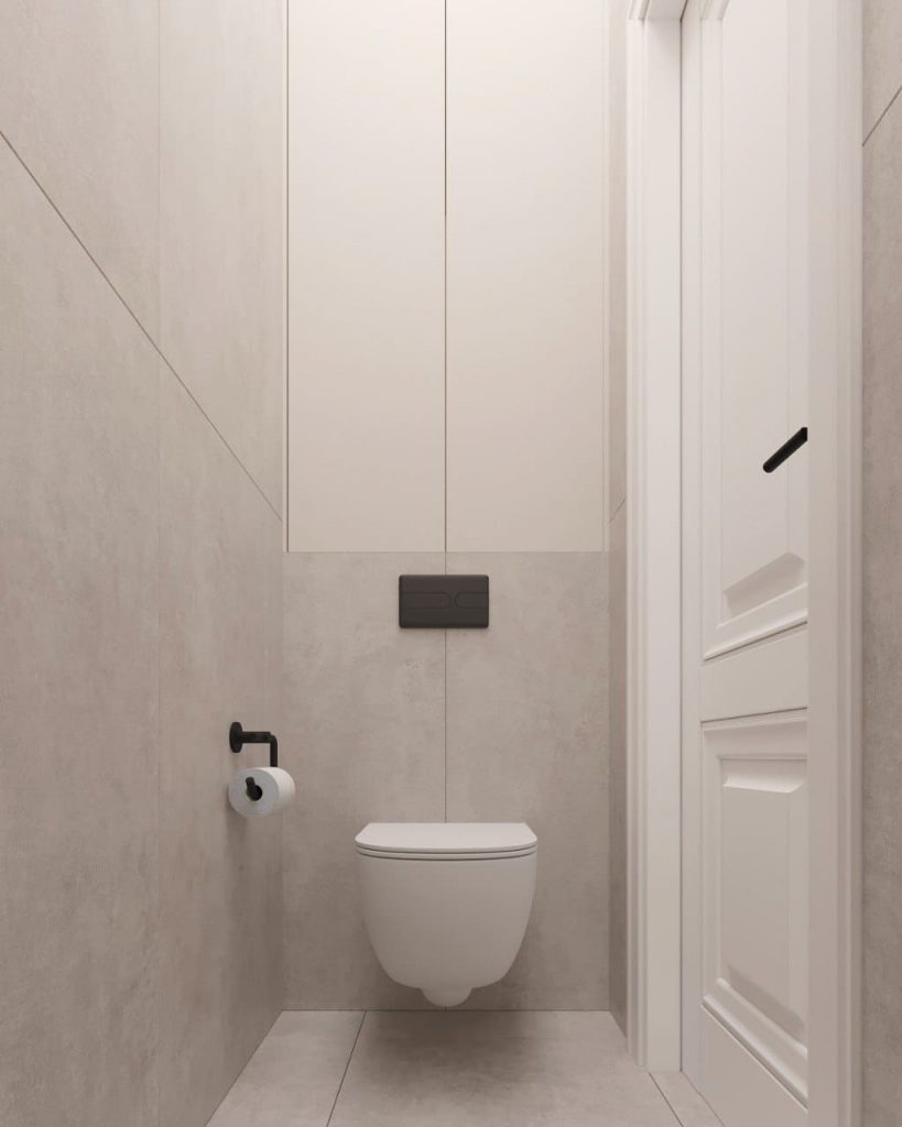 Визуальная чистота поддерживается встроенной инсталляцией и шкафом с фасадами под цвет стен — всё выглядит цельно и аккуратно. Несмотря на компактный метраж, нам удалось разместить полноценную зону с умывальником и зеркалом. Подвесные полки из натурального дерева придают интерьеру теплоту и выполняют роль удобного хранения для полотенец и мелочей. Черная фурнитура — актуальный акцент, который связывает оформление санузла с остальными помещениями квартиры. Здесь она добавляет графичности и современности, не утяжеляя интерьер.