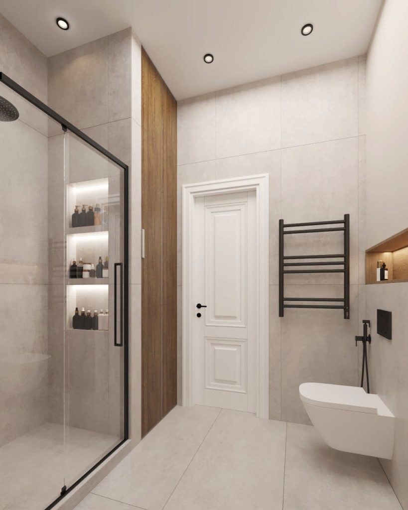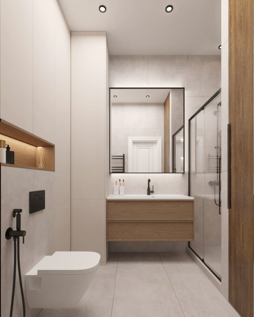 Компактная душевая с чёрной фурнитурой и стеклянной перегородкой вписана в нишу, а встроенные полки с подсветкой делают хранение не только удобным, но и эстетичным. Зона умывальника оформлена лаконично: подвесная тумба с ящиками из тёплого дерева, чёрный смеситель и большое зеркало без рамы визуально расширяют помещение.