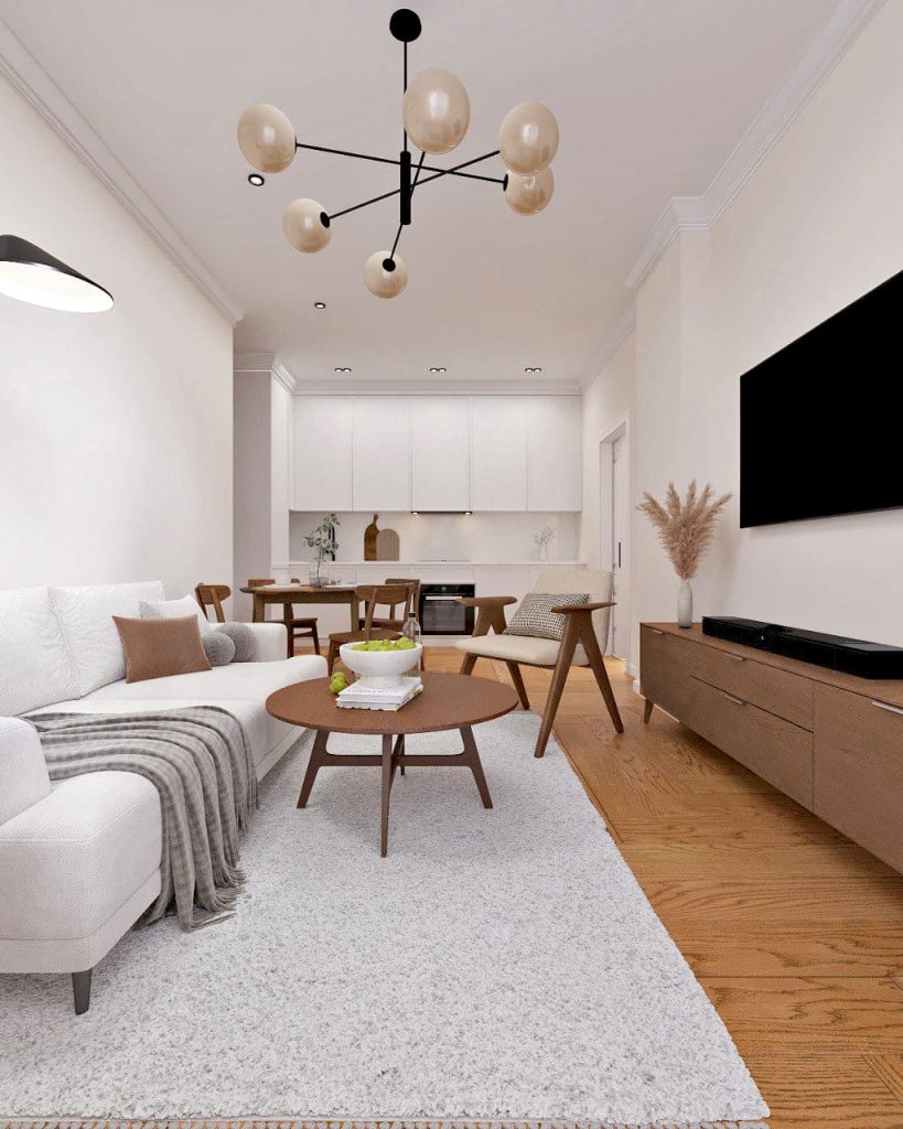 Интерьер этой квартиры создан для молодой девушки, которая ценит свет, лёгкость и естественную красоту. Основной задачей было сохранить ощущение простора, добавить натурального уюта и встроить все решения в уже заданную планировку — ведь мы работали с вайтбоксом без глобальных перепланировок.