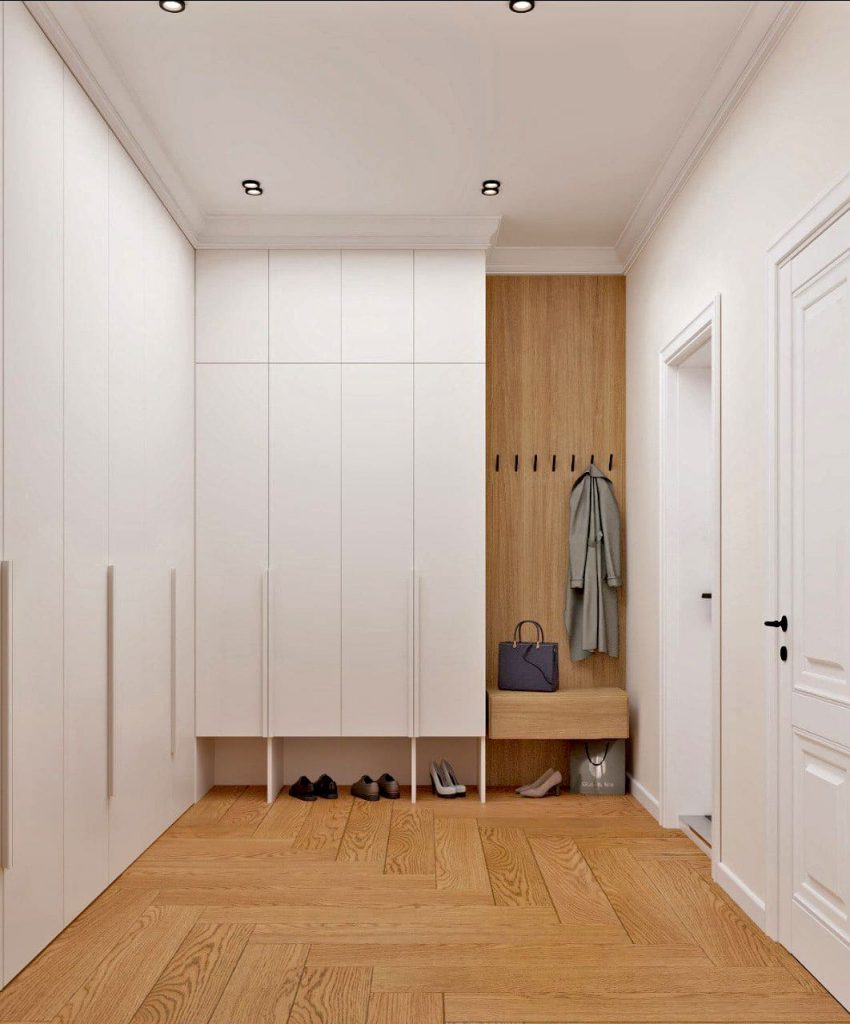 Вдоль одной стены разместили встроенные системы хранения с гладкими белыми фасадами — они буквально сливаются со стеной и не утяжеляют интерьер. Вторая зона — для быстрого доступа: здесь удобная скамья, крючки для верхней одежды и акцентная вставка из натурального дерева, которую мы использовали в качестве тёплого акцента.
