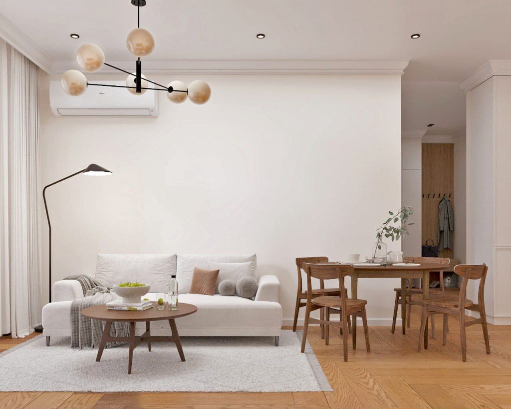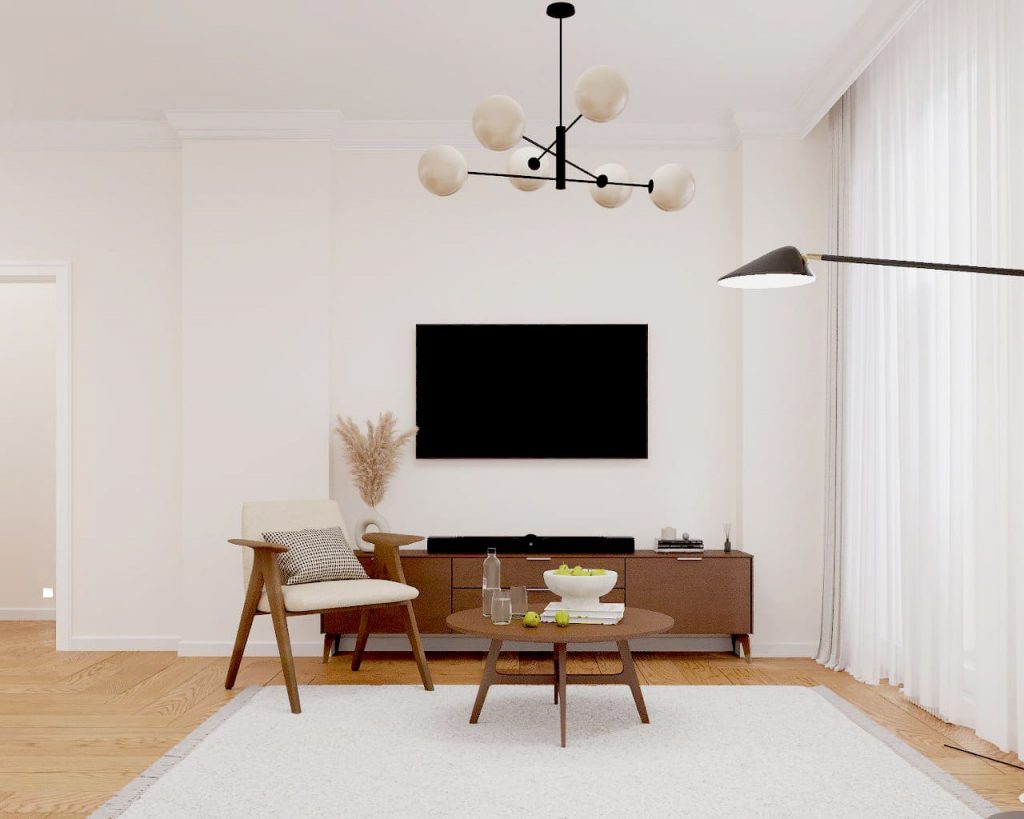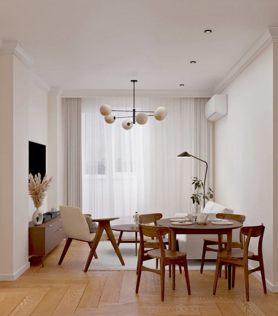 Гостиная зона — это про комфорт. Светлый диван, уютное кресло с деревянными подлокотниками, круглый журнальный стол и мягкий ковёр — всё дышит лёгкостью и уютом. Мебель из дерева здесь не просто акцент, а настоящая основа атмосферы. Каждый предмет — с характером, но при этом всё смотрится единым ансамблем.
