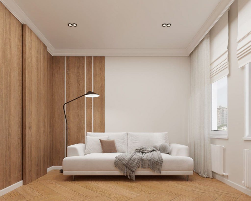 Акцентная стена с вертикальными деревянными панелями стала не просто элементом декора — она визуально выравнивает геометрию пространства и придаёт глубину. На её фоне белый диван выглядит особенно мягко — он отлично подойдёт и для отдыха с книгой, и как дополнительное место для гостей.