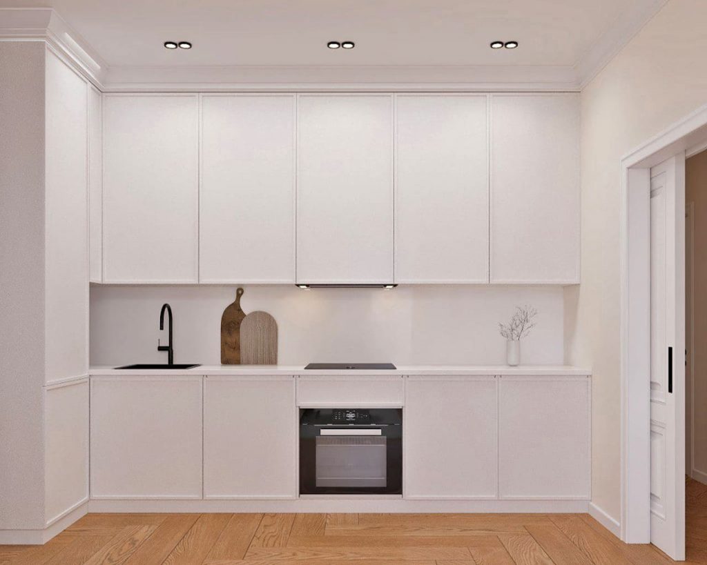В основе — спокойная светлая палитра, практически слившаяся со стеной кухня с матовыми фасадами и встроенной техникой. Мы намеренно сделали её максимально лаконичной — без ручек, без визуального шума, чтобы она не конкурировала с остальной частью комнаты. Благодаря перегородке с зеркалом у входа нам удалось увеличить рабочую поверхность, не нарушая общей гармонии.