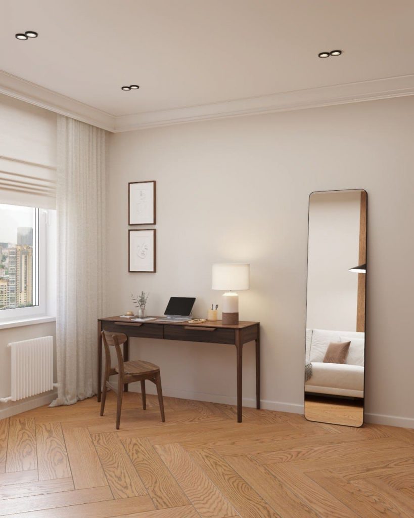 Напольное зеркало помогает расширить пространство и добавить света, а тёплый свет от настольной лампы делает атмосферу по-домашнему уютной в вечернее время. Окна оформлены лаконичными римскими шторами — они функциональны, не перегружают интерьер и дают нужную приватность.