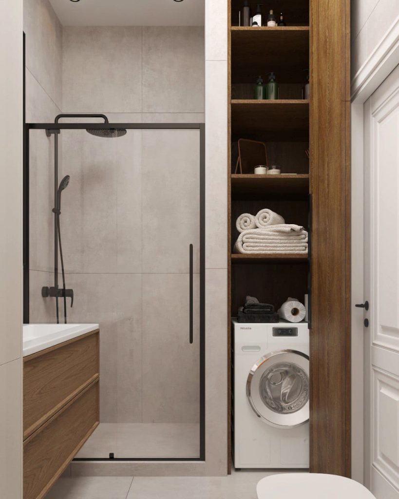 Один из самых удачных приёмов — интеграция стиральной машины в открытую нишу с деревянными полками. Это решение позволило организовать не только зону для стирки, но и полноценную систему хранения для полотенец и бытовой мелочи. Всё — под рукой и на своих местах.