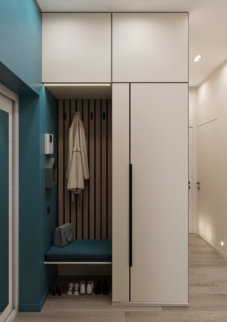 Все шкафы в прихожей выполнены на заказ по индивидуальным эскизам: от высоких встроенных систем хранения до открытых полок с местом для мелочей и скамейки с мягким бирюзовым сиденьем. Это не просто эстетика — это удобство каждый день. Даже обувь нашла своё место.
