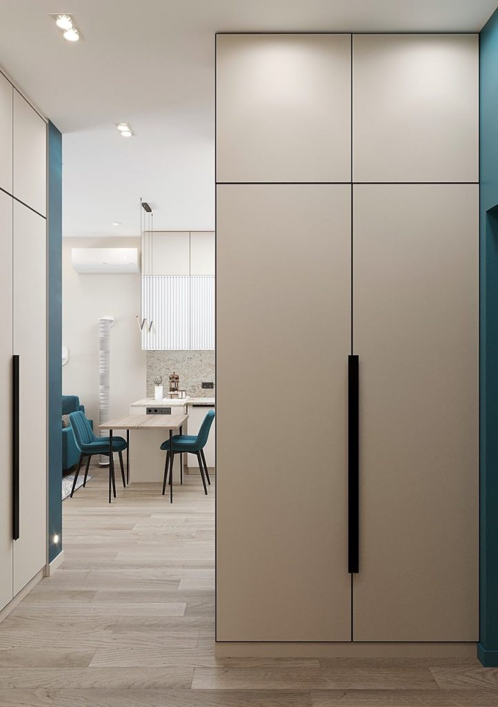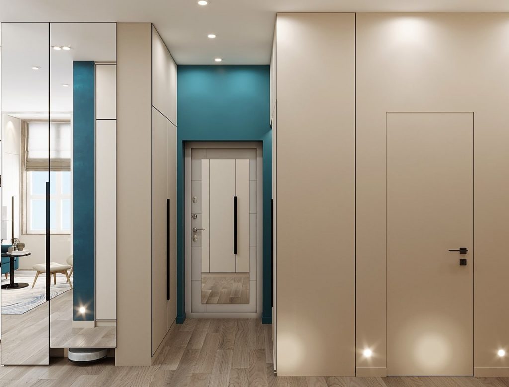 Этот интерьер — пример того, как даже в ограниченном пространстве можно создать современное, стильное и по-настоящему комфортное жилье для молодой семьи с ребёнком. Проект выполнен в светлой, натуральной палитре с акцентами бирюзы и мягких древесных оттенков, что делает пространство визуально просторнее и уютнее.