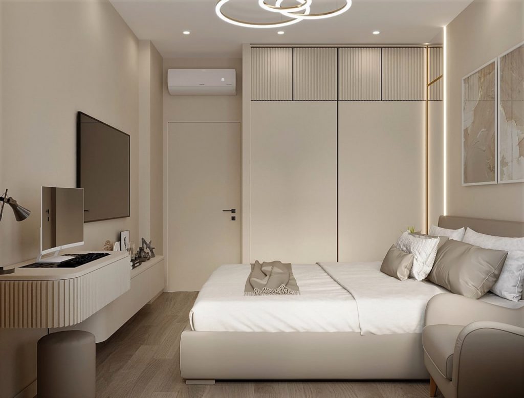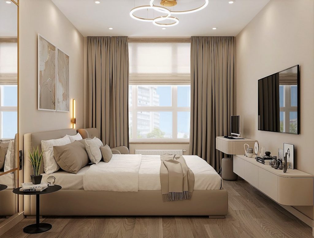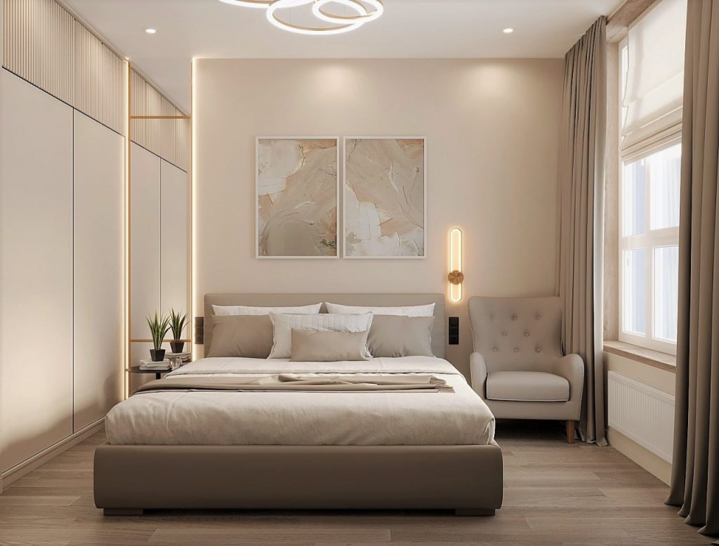 Центральное место занимает двуспальная кровать с мягким изголовьем и нейтральным текстилем. Над ней — абстрактные картины в нежной гамме, а по бокам — встроенные светильники-бра с тёплым вертикальным свечением. Они не только украшают, но и задают уютное вечернее освещение.