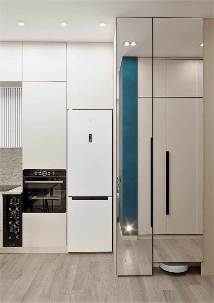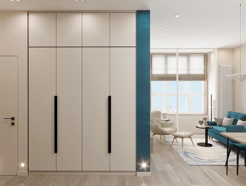 Бирюзовые акценты — не только в мебели, но и в архитектуре пространства: колонны, фрагменты стен, ниши. Они придают характер и перекликаются с настроением всей квартиры.