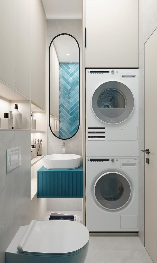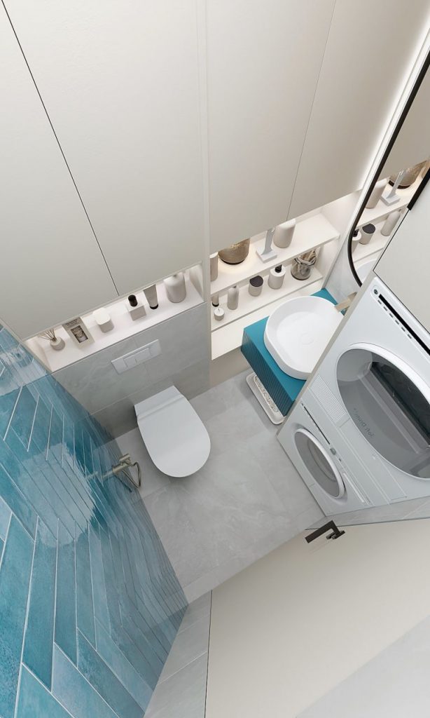 Компактный, но максимально продуманный санузел совмещает эстетику и функциональность. Несмотря на небольшую площадь, в нём удалось разместить всё необходимое — подвесной унитаз с гигиеническим душем, вместительные системы хранения, стиральную и сушильную машины, умывальник с тумбой и большое зеркало с подсветкой. Акцентная стена с синей плиткой «ёлочкой» визуально вытягивает пространство и перекликается с отделкой в ванной комнате. Тумба под раковиной выполнена в насыщенном бирюзовом цвете, добавляющем глубины интерьеру. Множество закрытых и открытых полок обеспечивает порядок и удобство в ежедневном использовании.