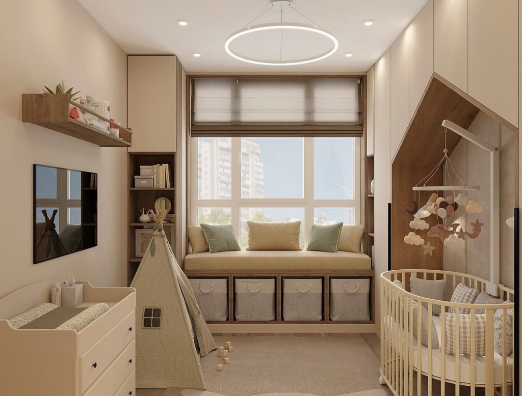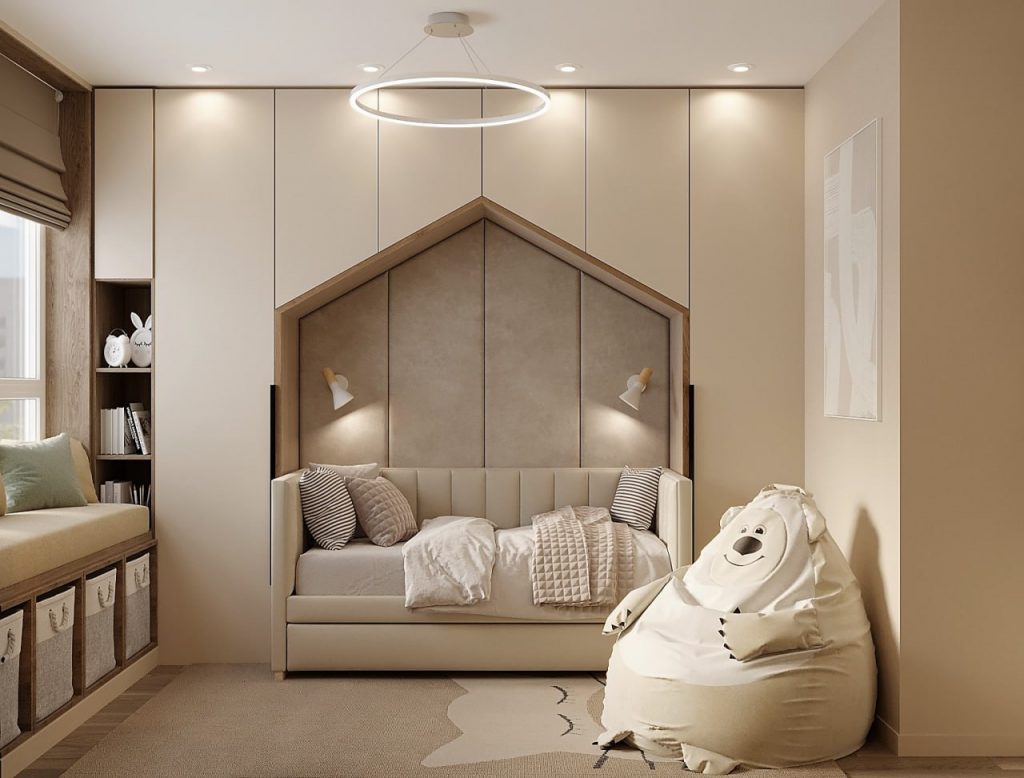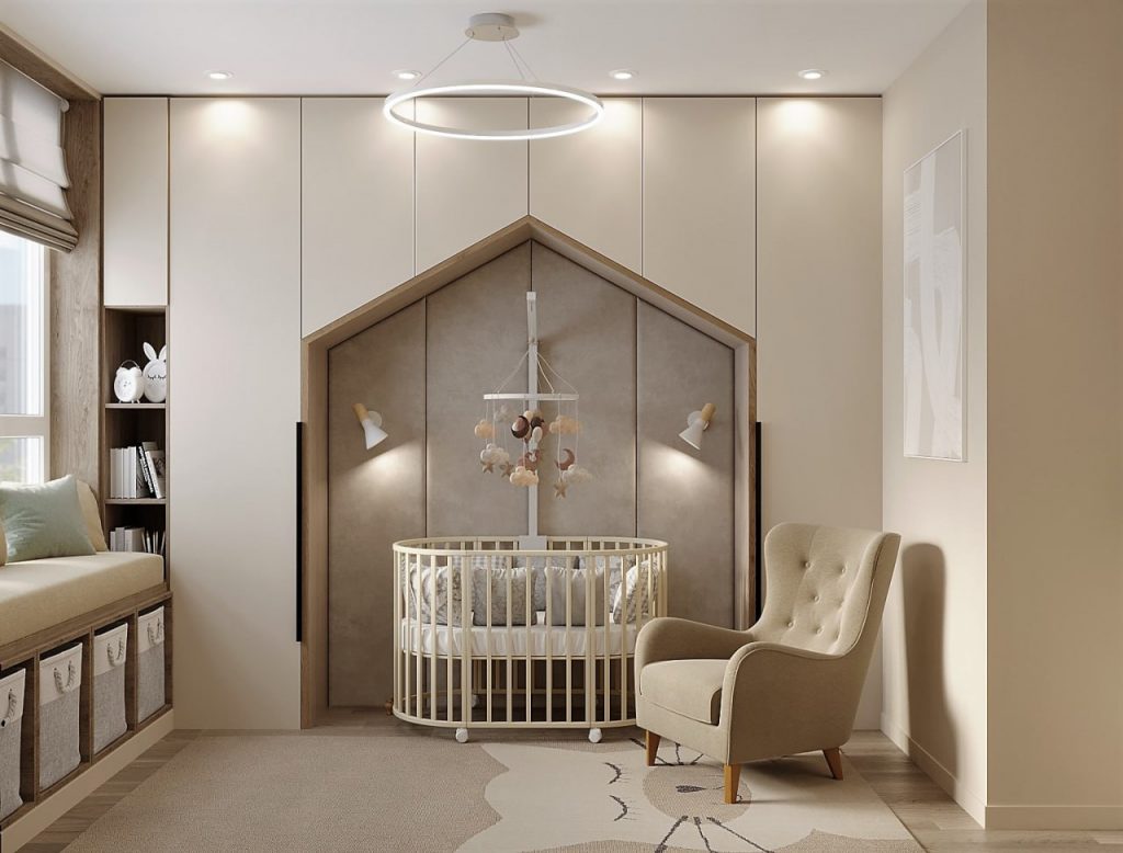 Главный акцент — спальное место. Круглая кроватка уютно вписана в нишу с декоративной отделкой в форме домика. Мягкие панели с подсветкой по бокам создают ощущение защищённости и при этом функциональны: ночью можно включить свет, не разбудив ребёнка.