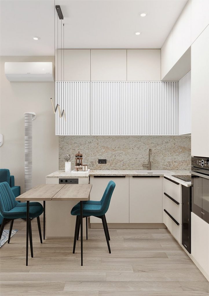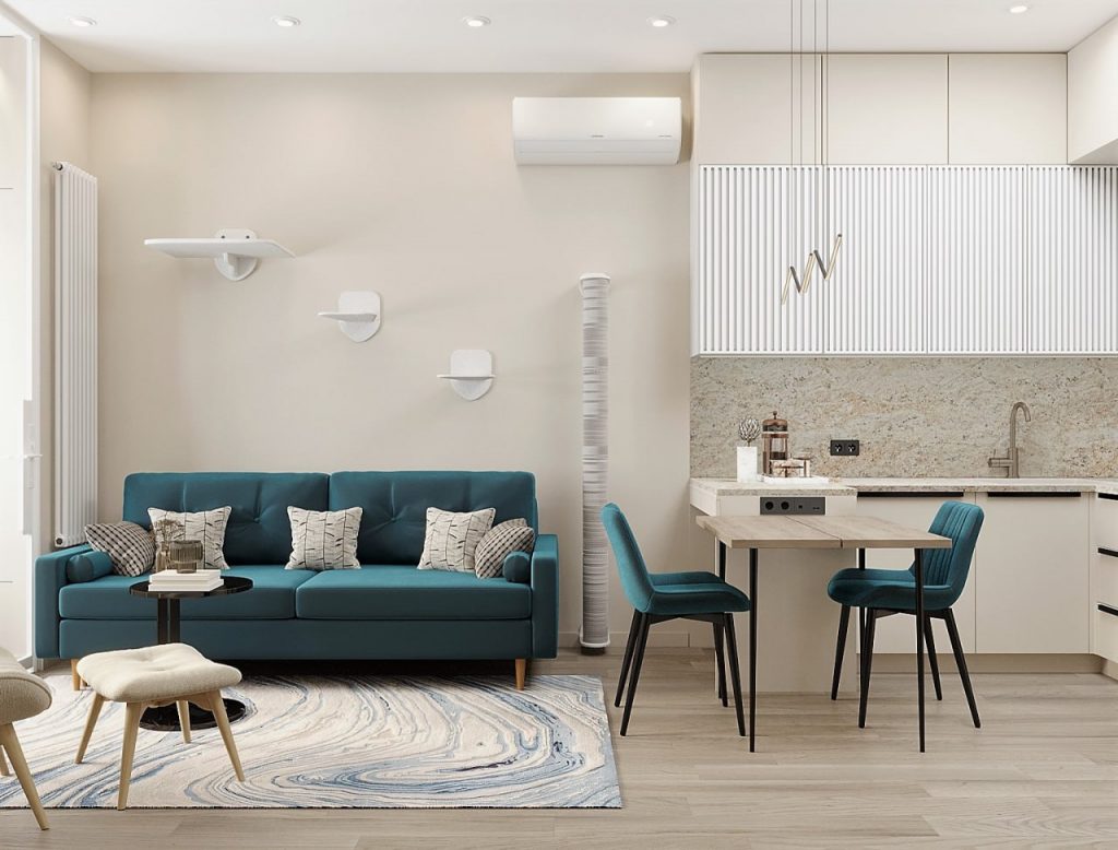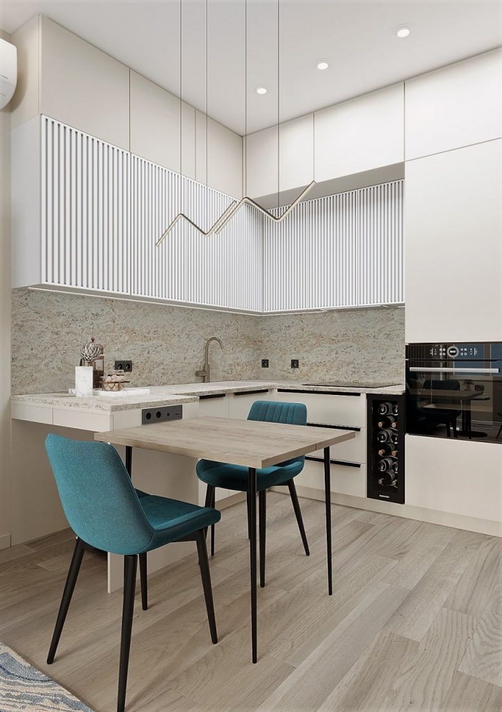 Маленький, но функциональный обеденный стол плавно вытекает из барной столешницы, экономя пространство. А бирюзовые стулья добавляют нужный акцент — мягкий, но выразительный. Этот цвет проходит через весь интерьер как единая нить настроения.