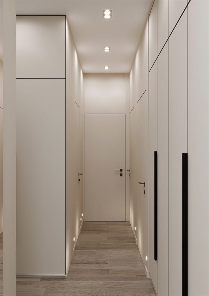 Освещение зонировано: трековые светильники, встроенные потолочные источники, точечные светильники у пола. Всё это делает интерьер визуально легким и современным, не перегружая узкое пространство прихожей.