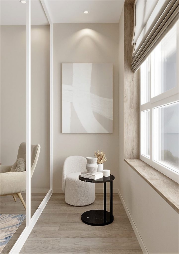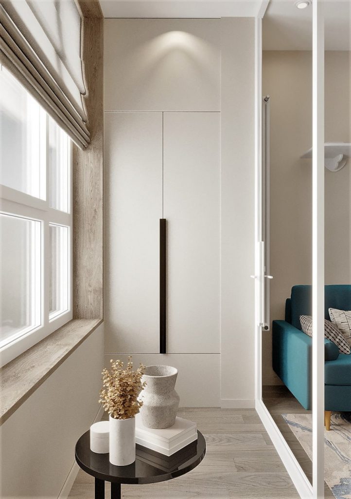 Небольшой, но функциональный балкон стал продолжением гостиной зоны. Он оформлен в единой цветовой гамме — светлые фасады, дерево под натуральный дуб, и графичная чёрная ручка шкафа создают ощущение уюта и стиля. Встроенный шкаф используется как дополнительная система хранения — отличное решение для сезонных вещей или бытовых принадлежностей. Декоративный столик с вазами добавляет уют и подчёркивает, что балкон — не просто техническое помещение, а полноценная часть жилого пространства. Панорамное окно наполняет зону светом, а отделка откосов и подоконника деревом делает композицию цельной.