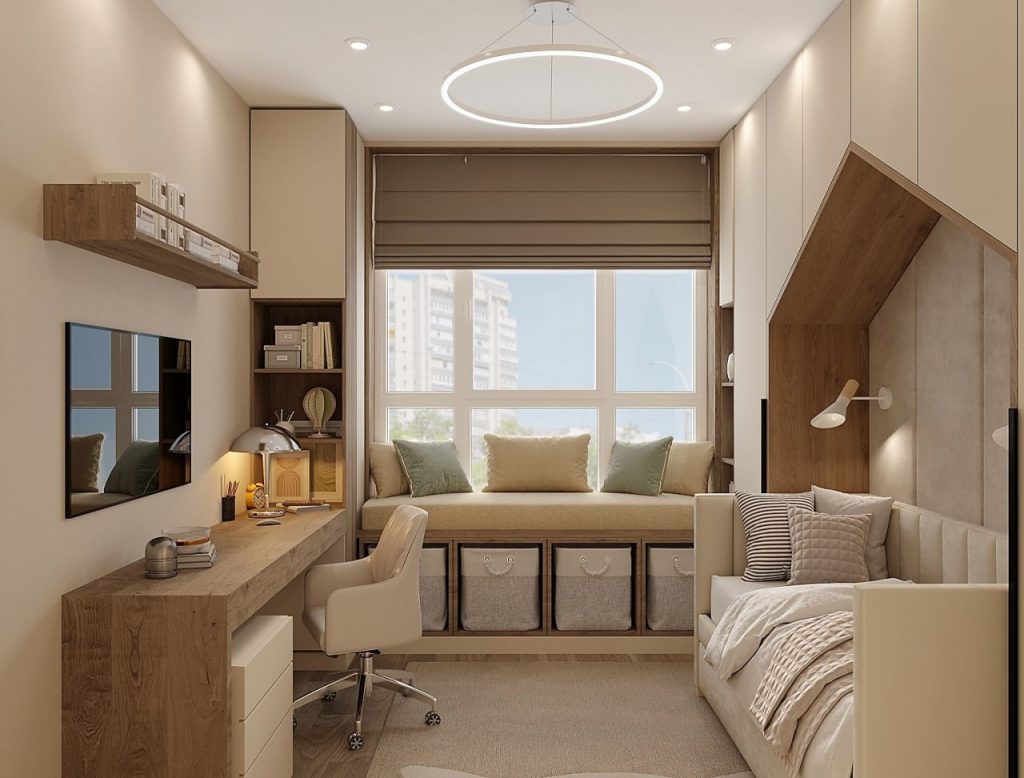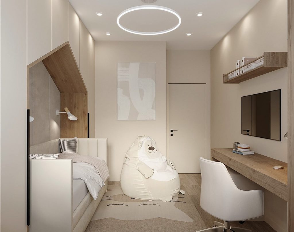 Этот вариант детской задумывался с прицелом на будущее: когда малыш подрастёт, появятся первые школьные задания, любимые книжки, игры с друзьями и важное “моё место”. Мы превратили эту комнату в полноценную детскую для дошкольника или младшего школьника — со своей атмосферой, но в общей стилистике всей квартиры.