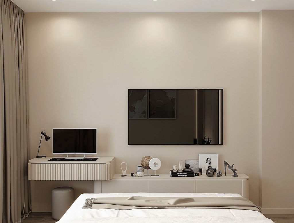Рабочее место в спальне — компактное, но стильное. Модуль с рифлёными фасадами, аккуратный монитор, торшер и удобный пуфик — отличный вариант для фокусной работы в тишине. А вдоль стены — навесная консоль с любимыми мелочами, книгами и декором, который делает интерьер по-настоящему личным.