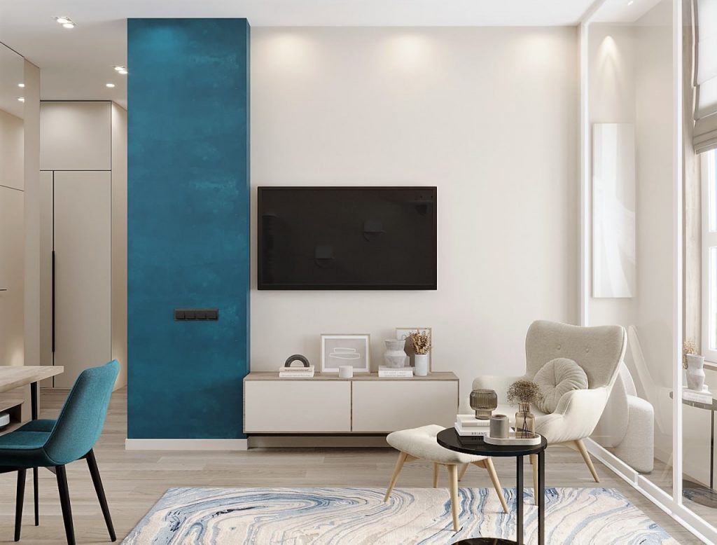 Гостиная продолжает концепцию — минимализм с характером. Бирюзовый диван на ножках и светлое кресло с пуфом создают комфортную зону отдыха. Под телевизором — навесная тумба и лёгкий декор, а рядом — эффектная акцентная стена, выкрашенная в глубокий бирюзовый. Она задаёт настроение и зонирует пространство.