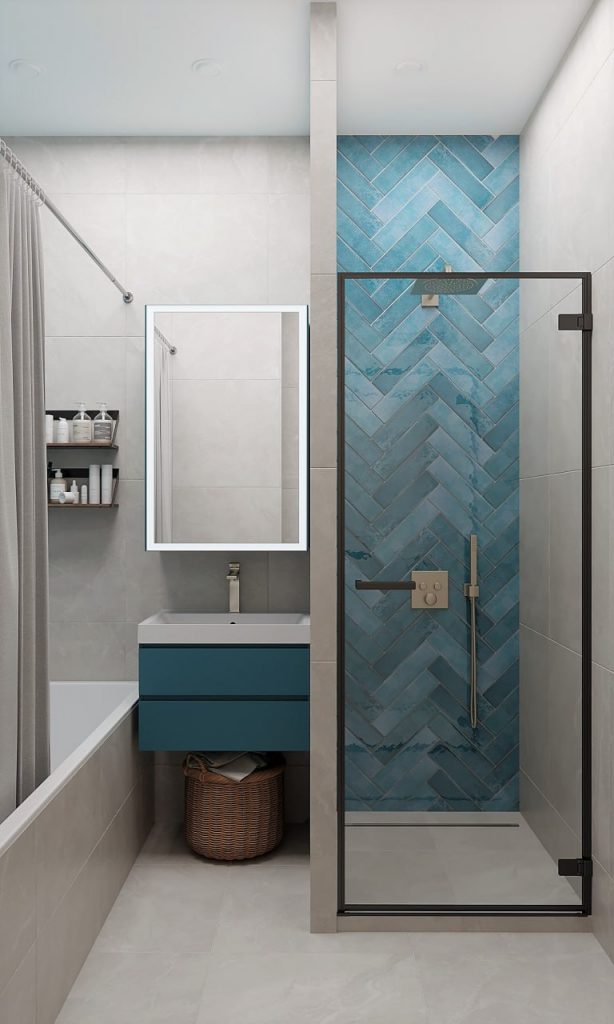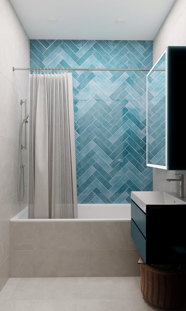 Главный визуальный акцент — бирюзовая плитка «ёлочкой» на стенах зоны душа и над ванной. Оттенок меняется от приглушённого до насыщенного, напоминая морскую гладь. Это отсылка к общей цветовой гамме квартиры, но здесь — в более насыщенном, свежем исполнении. Остальные стены облицованы нейтральной плиткой под камень, чтобы сбалансировать интерьер.