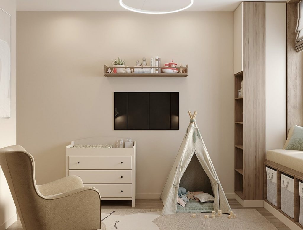 Вдоль стены разместили комод с пеленальным матрасом, полку с нужными мелочами, телевизор — чтобы можно было ненадолго включить детскую музыку или мультики. А рядом — зона игр с палаткой-вигвамом: уютный уголок для уединения и фантазий.