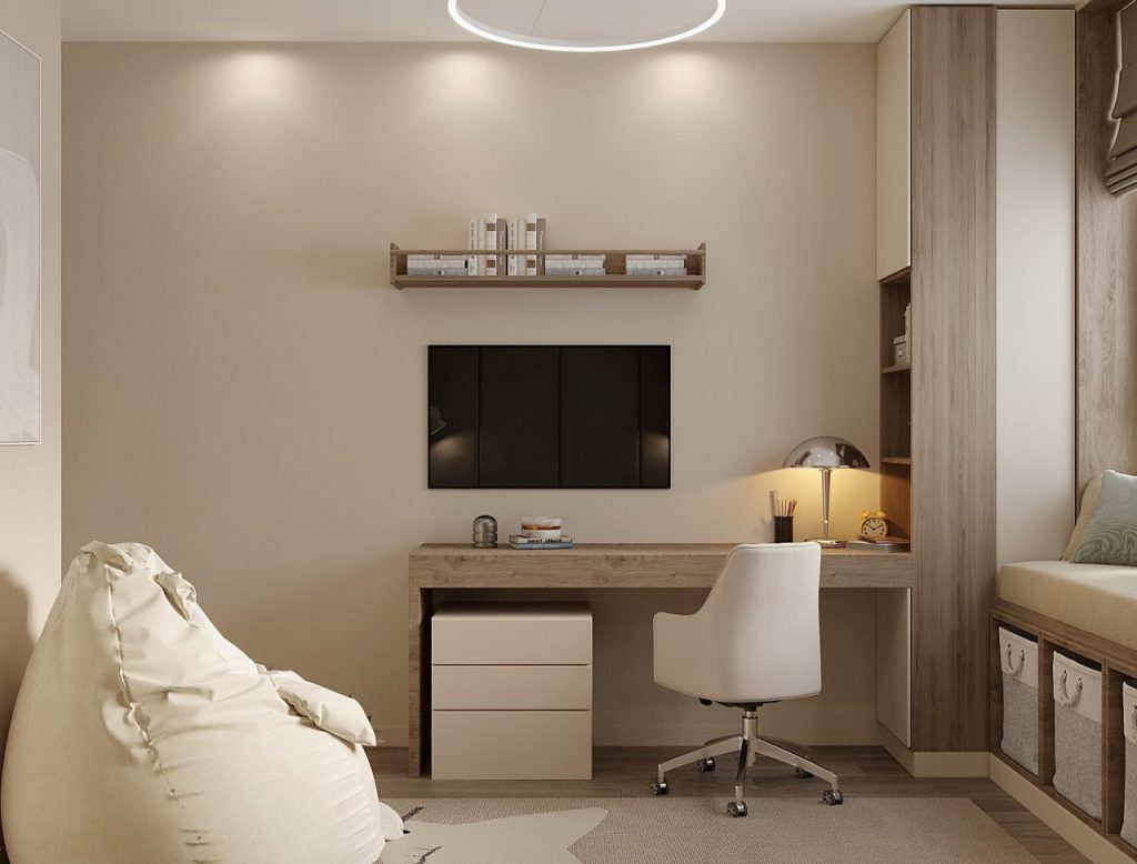 Рабочая зона появилась на месте пеленального комода — с полноценным столом из тёплого дерева, выкатными ящиками, удобным креслом и акцентной настольной лампой. Над столом — полка и телевизор, всё под рукой и без лишнего визуального шума.