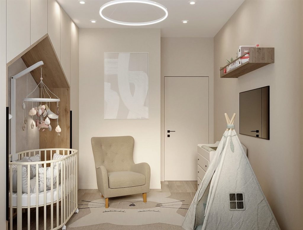 Шкафы и стеллажи — встроенные, выполнены по индивидуальному проекту, чтобы вместить всё, что нужно для первых лет жизни и не загромождать комнату визуально. Светильник в форме кольца на потолке дополняет мягкое рассеянное освещение, создавая комфортную атмосферу в любое время суток.