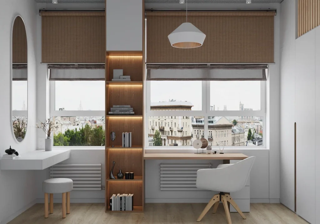 Помещение для детской хоть и небольшое, но наполнено уютом и всем необходимым. Белый цвет хорошо расширяет пространство, а дерево добавляет уюта – это идеальное сочетание для маленького пространства. Диван-кровать служит спальным местом и релакс-зоной. У окна разместили рабочее место и книжные полки, а под большой строенный шкаф выделили одну сторону комнаты, там же спрятали и кондиционер за деревянными рейками. Также удалось разместить небольшой туалетный столик с зеркалом.