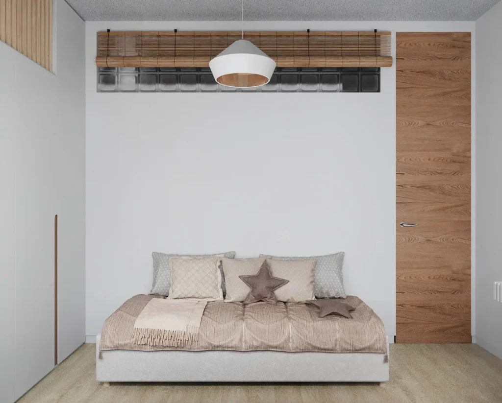 Интерьер второй детской продуман по аналогии с предыдущей детской комнатой, но есть небольшие отличия в расположении мебели. Здесь мы видим те самые стеклянные блоки, которые с другой стороны выходят на кухню, они отлично выполняют свою функцию и имеют хорошую шумоизоляцию.