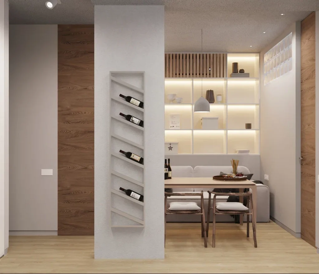 Из прихожей сразу попадаем в гостиную. По планировке пространство гостиной не имеет своего окна, но здесь это и не обязательно. Уюта добавляет отделка стен реечными панелями, деревянные рейки и подсветка в мебели. Заодно здесь располагается и обеденная зона. Несущую колонну обыграли полками для вина.