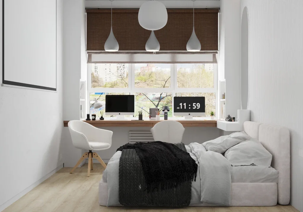 Спальня для супругов наполнена белым цветом почти полностью, но за счет этого кажется более просторной. Пространство продумано для двоих человек. Помимо спального места и большого шкафа, разместили большое рабочее место из деревянной столешницы у окна, подвесные каплевидные светильники подсвечивают эту зону и добавляют декоративности. Для супруги разместили небольшой туалетный столик. Вместо телевизора решили повесить проектор, так картинка получается гораздо больше по формату.