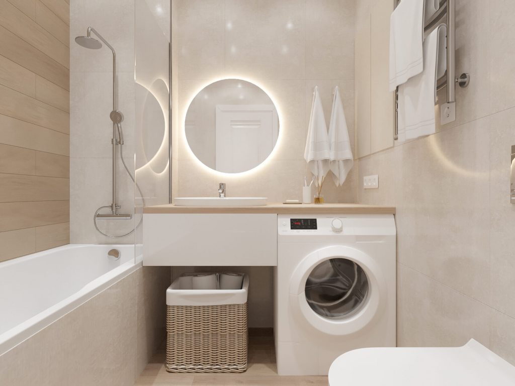 Светлая плитка, дерево в отделке столешницы и тёплая подсветка вокруг зеркала делают интерьер уютным и визуально просторным.