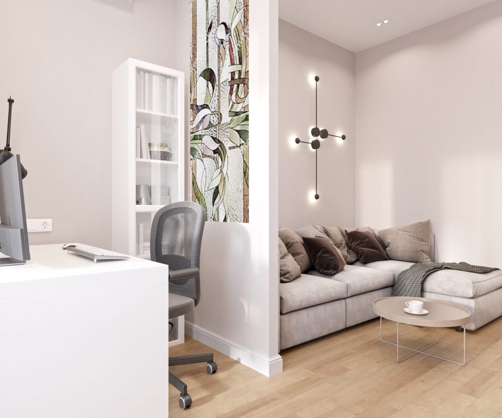 По просьбе заказчика рабочая зона была зонирована интересно и ненавязчиво. Мы использовали декоративную перегородку с витражом — тот самый, который подбирался индивидуально. Его стекло с золотистыми и серебристыми акцентами делает интерьер чуть богаче, не утяжеляя его.
