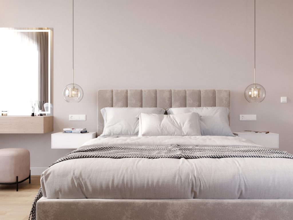 Центром композиции стала кровать с высоким изголовьем в обивке под вельвет, поддержанная лаконичными подвесными тумбами и стеклянными светильниками, парящими по бокам. Никаких лишних деталей — только то, что действительно нужно для отдыха.