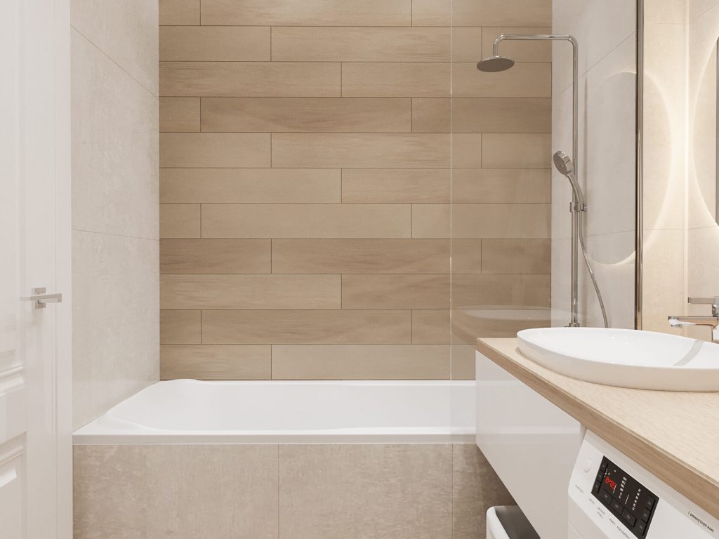 Ванна с душевой стойкой отделена стеклянной перегородкой — практично и современно. Сама душевая зона облицована керамогранитом с фактурой дерева, что добавляет тепла и уюта.