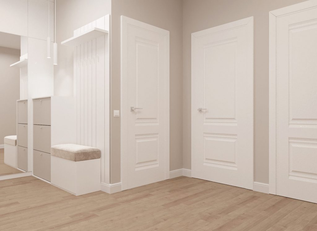 Светлые стены и белые двери в сочетании с тёплым кварцвинилом под дерево создают уют и визуально расширяют пространство. Зеркало в полный рост добавляет глубины, а потолочные светильники дают мягкий, равномерный свет.
