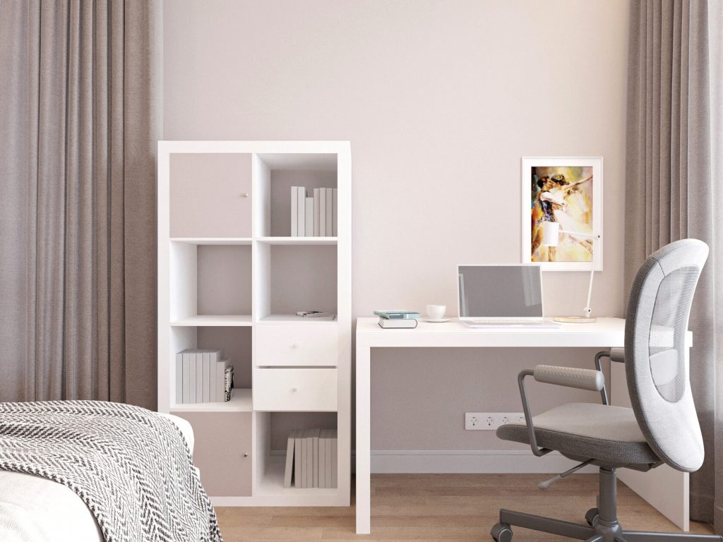 Вдоль окна — функциональная зона с рабочим столом. Она не нарушает общее визуальное спокойствие комнаты: лаконичный белый стол, стеллаж в том же стиле и спокойная картина на стене не перетягивают внимание, а органично вписываются в интерьер.