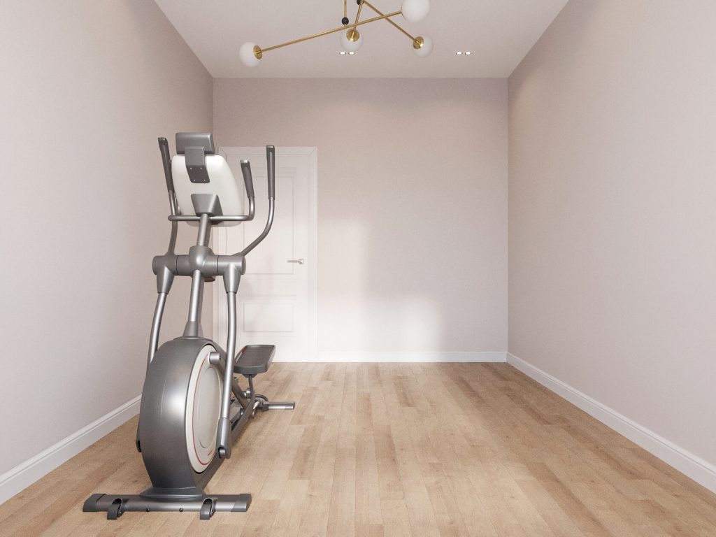 Помещение оформлено в едином стиле с остальной квартирой: светлые стены, тёплый кварцвинил под дерево, мягкий рассеянный свет. Всё это делает комнату спокойной, не отвлекающей от цели — движения и восстановления. Пока здесь установлен только эллиптический тренажёр, но пространство позволяет дополнить его, например, ковриком для йоги, небольшим шкафом для спортивных аксессуаров или зеркалом на стену. Важно, что даже в этой комнате предусмотрено качественное освещение и кондиционер — заниматься будет комфортно в любое время года.