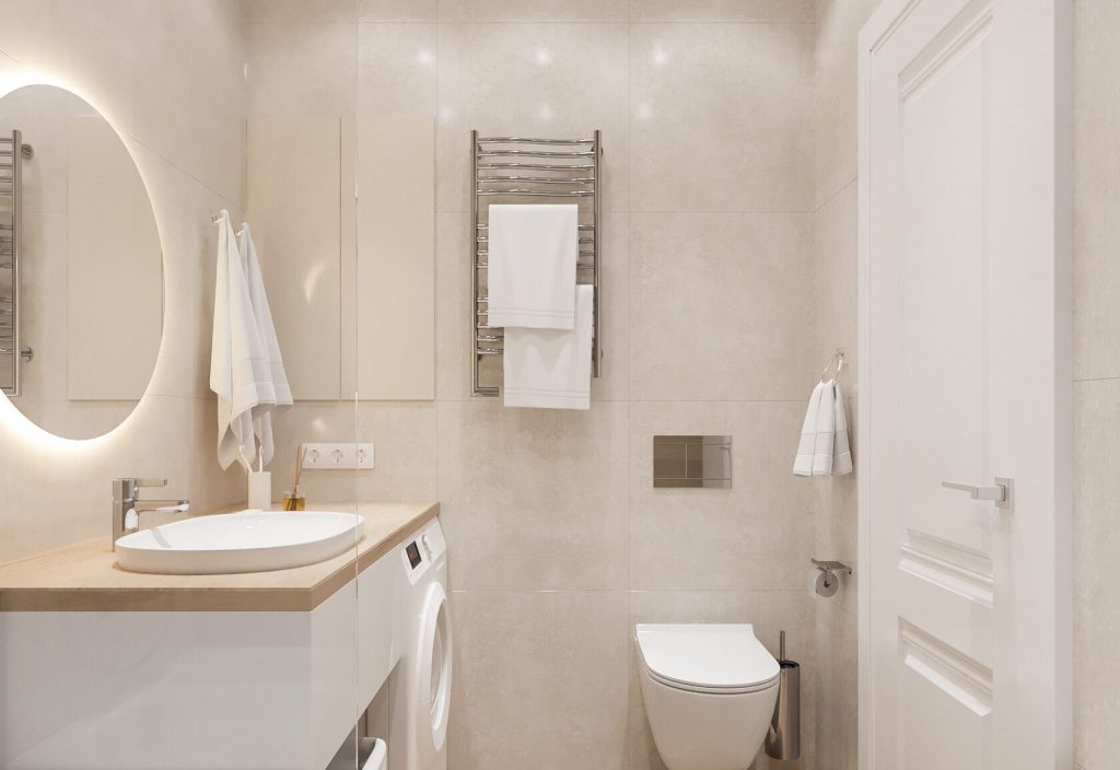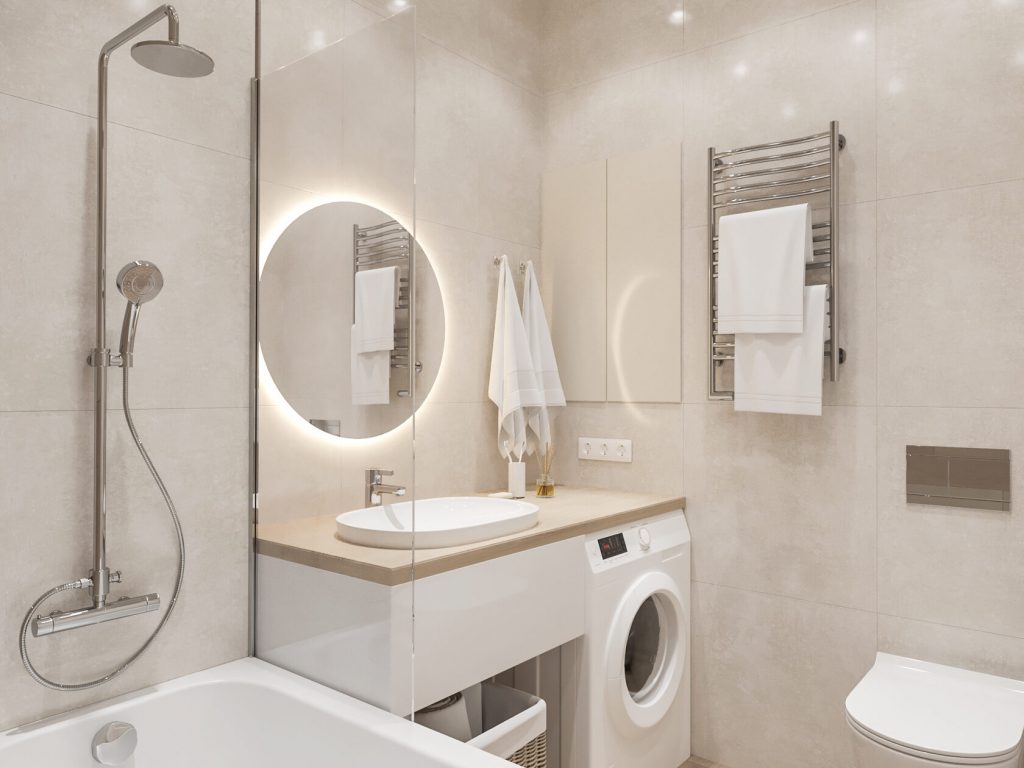 Даже в небольшом пространстве удалось предусмотреть всё необходимое: инсталляция, корзина для белья, зеркало с подсветкой, полотенцесушитель и удобные розетки.