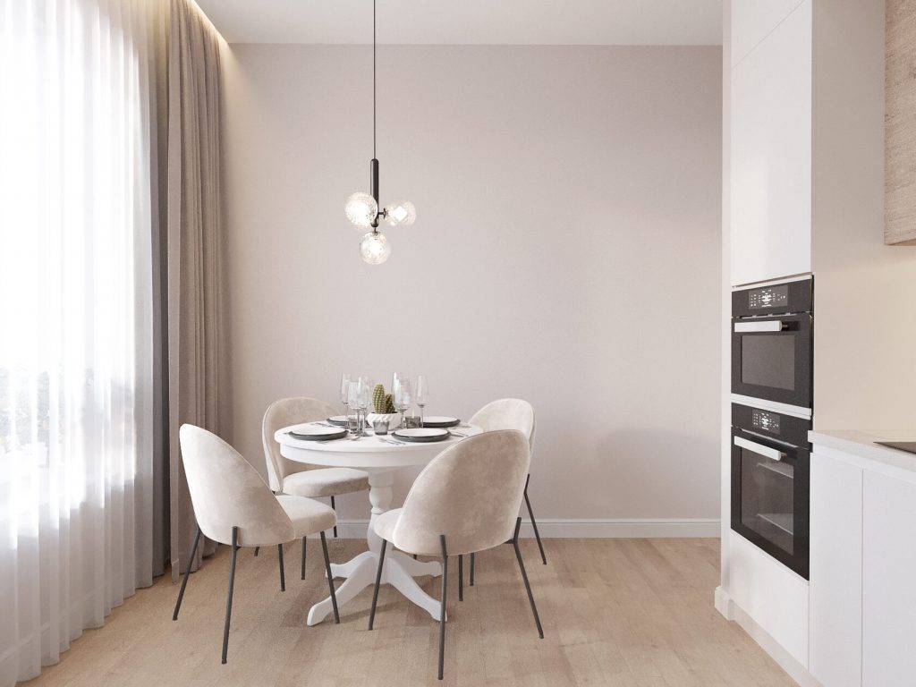 Обеденная зона получилась особенно камерной. Круглый стол и мягкие кресла приглашают задержаться подолго, а светильник с шарообразными плафонами добавляет нотку лёгкой дизайнерской игры.