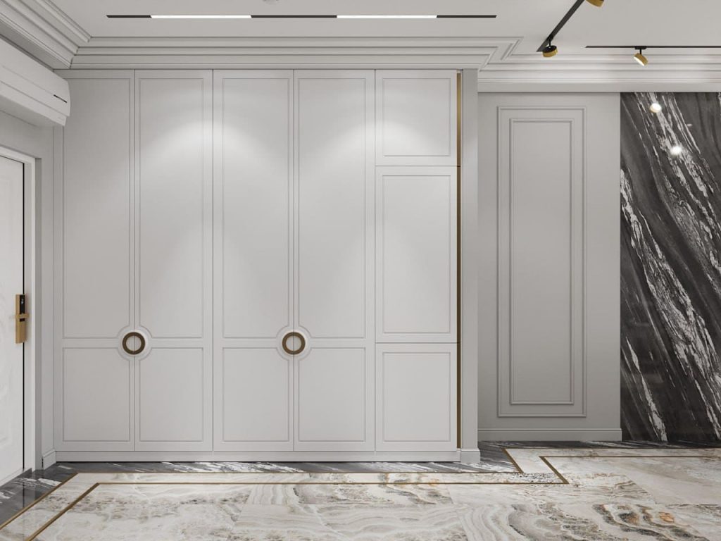 И прихожая всецело отвечает заданным векторам - в ней только необходимый минимум - зеркало от пола до потолка, в которое можно посмотреться перед выходом из дома, оригинальный столик-консоль для ключей с золотистым основанием-струнами и встроенный гардеробный шкаф до потолка. Уют прихожей придает мягкая подсветка зеркала, а основное освещение представлено подсветкой потолка.