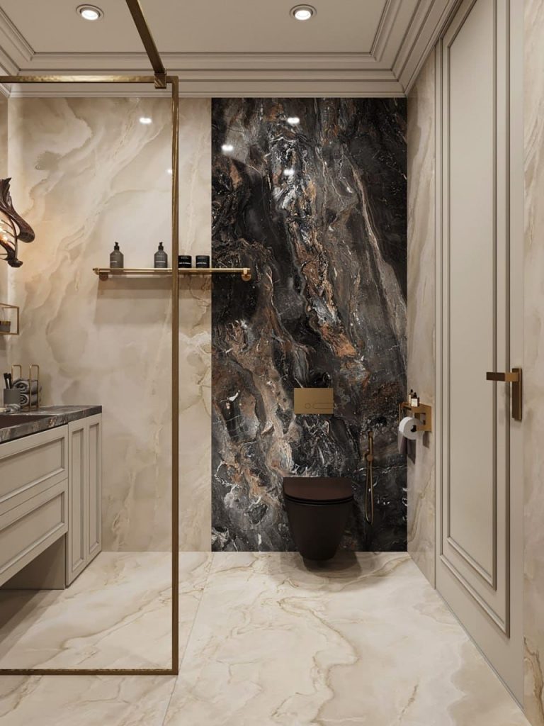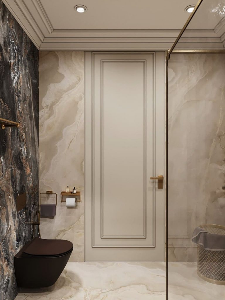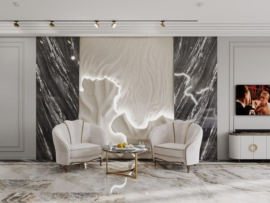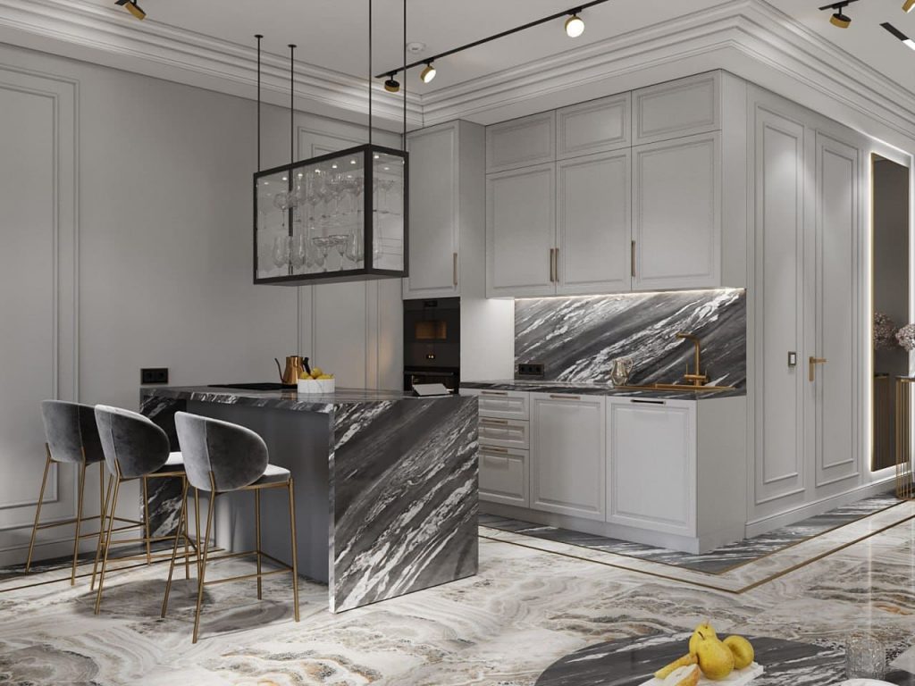 Этот дизайн-проект составлялся для семейной пары. Квартира-студия находится в здании премиум класса, которое разрабатывал известный на весь мир испанский архитектор Рикардо Бофилл. Фасадная часть дома украшена оригинальными эркерами и панно из натурального камня, соединяющего в себе пять оттенков травертина, олицетворяющих фасады старинных испанских улиц. В комплексе шикарное лобби из мрамора, оникса и латуни, окна панорамного типа, красивые виды на Екатерининский парк и исторические усадьбы начала 20 века.