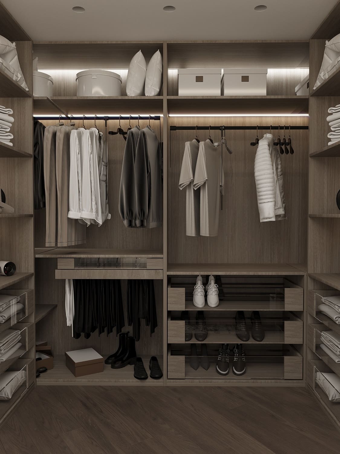Открытые секции с подсветкой позволяют легко ориентироваться и поддерживать порядок: есть место для верхней одежды, рубашек, повседневных вещей и аксессуаров. Для обуви предусмотрены отдельные ниши с прозрачными фасадами, а выдвижные ящики обеспечивают аккуратное хранение мелочей.