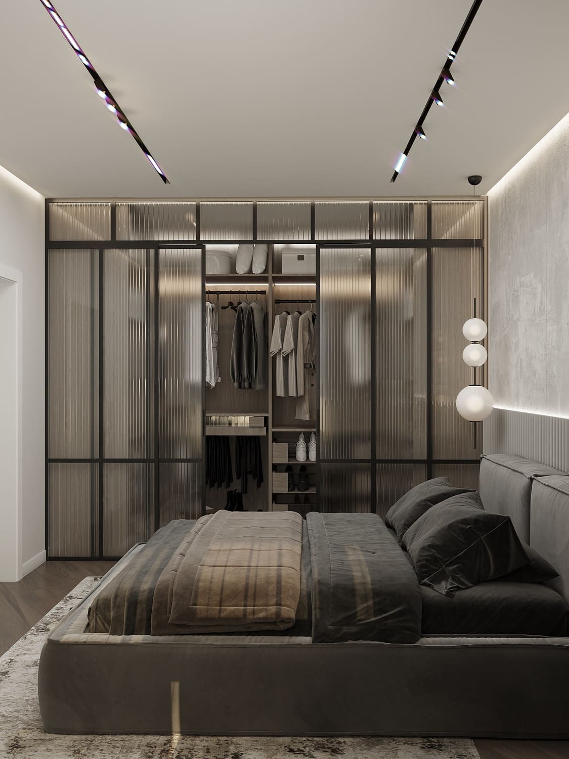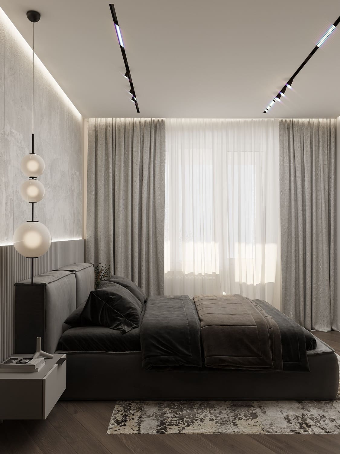 Спальня оформлена в спокойных серо-бежевых тонах, где главная роль отведена текстурам. Стена за изголовьем сочетает панели с вертикальным рельефом и декоративную штукатурку, что создаёт глубину и динамику при минимальном наборе цветов. Мягкая кровать с объёмным изголовьем и спокойное текстильное оформление делают пространство уютным и камерным. Атмосферу дополняет подвесной светильник из трёх шаров — он выступает и функциональным, и декоративным элементом, создавая мягкое рассеянное свечение.