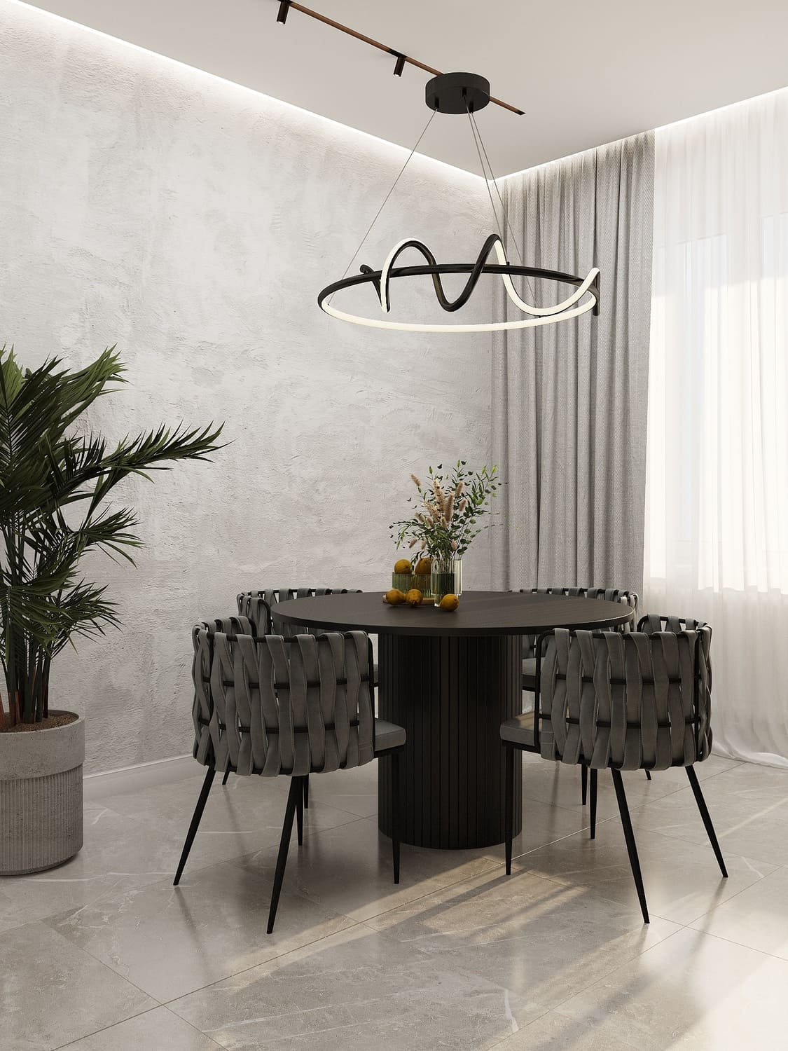 Обеденная зона выполнена в том же ключе: круглый стол на массивной центральной опоре и дизайнерские стулья с плетёными спинками создают эффект лёгкой скульптурности. Благодаря этому интерьер смотрится не просто функциональным, а изящным и цельным.