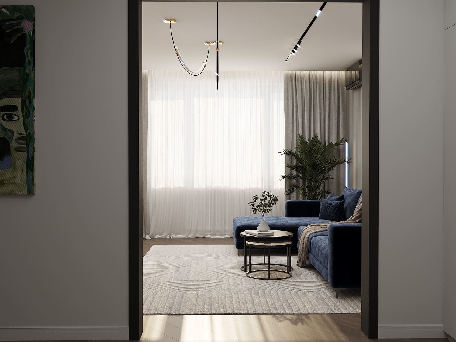 Гостиная стала центральным пространством квартиры, где минимализм приобретает выразительность за счёт цвета и акцентов. Главная роль здесь у глубокого синего дивана из велюра — он вносит насыщенность и при этом задаёт ощущение уюта. Фон для мебели создан из спокойных текстур: стена с декоративной штукатуркой и зона с деревянными панелями, плавно подсвеченными мягкой подсветкой.