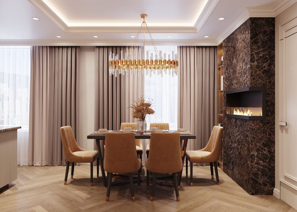 Обеденная группа располагается ближе к окну — просторный стол на шесть персон, мягкие кресла благородного карамельного оттенка, и, конечно, элегантный камин на фоне тёмного мрамора, который задаёт точку притяжения всему пространству. По бокам — встроенные ниши с подсветкой и декором, которые визуально уравновешивают камин и добавляют интерьеру архитектурной глубины.